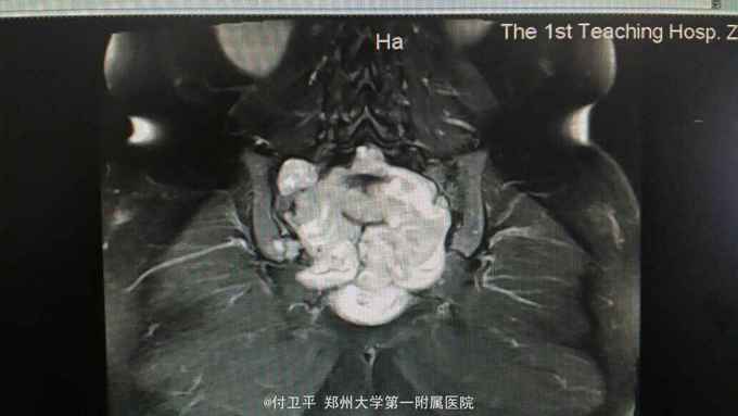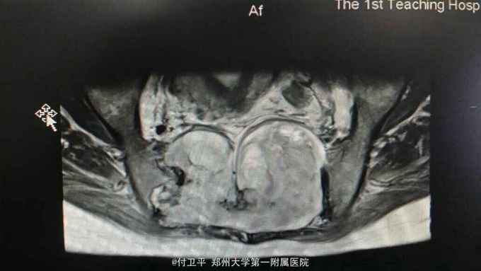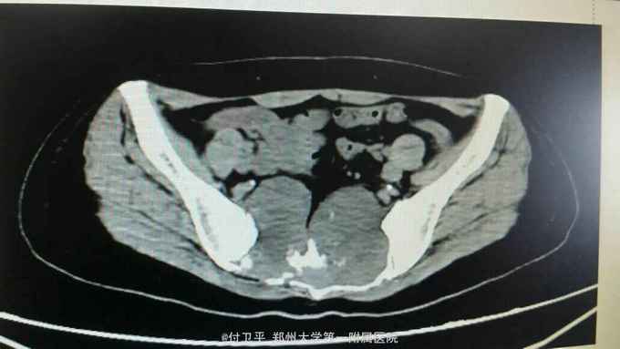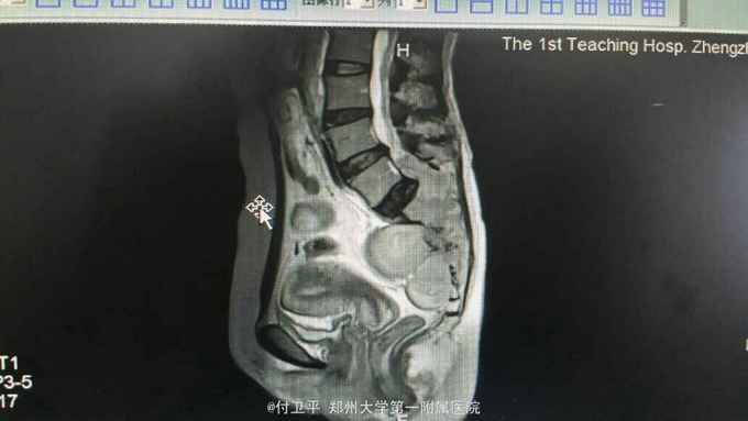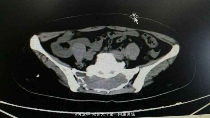 患者女,49岁。 主诉:骶尾部疼痛1月余,小便不畅2周。至当地行DR回示:骶尾部占位。