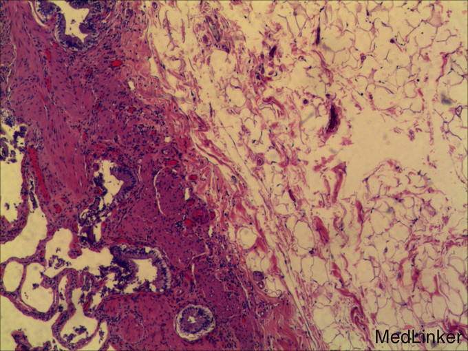 查体: 皮肤黏膜无黄染及苍白,腹部膨隆,腹肌软,未触及肝脏肋下缘,无肝震颤。 辅查: 1.腹部CT:1.肝内多发囊肿,其中右叶可见巨大囊肿。 2.胆囊结石。 3.右肾小囊肿;左肾小结石。 2.术后病检: 1(胆囊)送检5.5x2x1cm组织一块,内见结石。镜下:慢性胆囊炎,胆囊结石。2(囊壁)送检直径6cm囊壁样组织一块,囊壁厚0.1cm。 镜下:送检纤维囊壁样组织,部分囊壁披覆单层上皮,局部囊壁可见少量肝组织,病变符合肝囊肿。