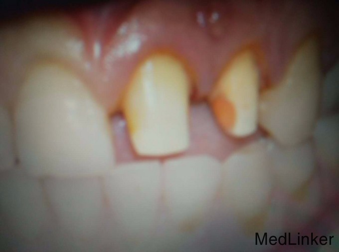 患者前门牙,龋坏露神经,要求治疗后,二氧化锆烤瓷牙修复
