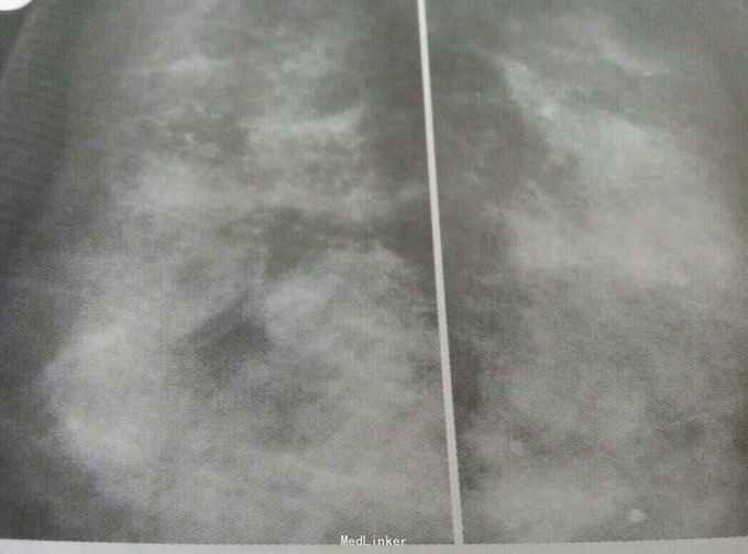 查体:未及明显异常。 辅助检查:超声未发现明显异常,可见多个大小约0.3-0.5cm低回声区,乳腺增生明显。 钼靶:双乳上方多发散在分布的细小钙化,钙化大小密度不均,建议定期随访或切取活检。