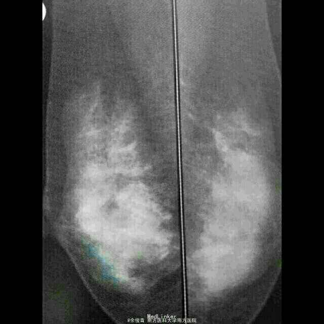随访:患者术后定期复查,未发现明显异常。 讨论:其实一看钼靶就比较倾向良性的钙化,但考虑患者年龄以及患者自身忧虑的心态,故考虑活检。这类病人一般为良性钙化,即纤维囊性乳腺病,但偶尔也能发现比较早期的乳腺癌,大多为原位癌,但我们不建议过度医疗。