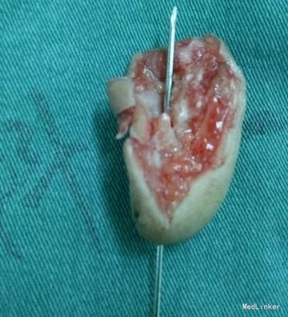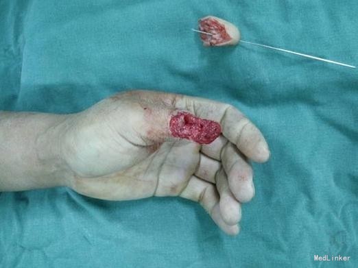 远端自甲根以远紧贴着近节指骨掌侧离断,指腹大部分留存于近端,近节指骨粉碎性骨折伴骨缺损