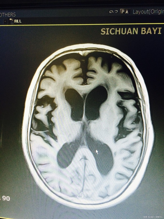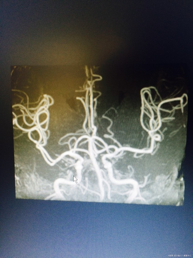 入院查体:血压165/100mmHg,扶入病房,查体合作欠佳,反应迟钝,语言缓慢,记忆力下降,定向力基本正常。四肢肌张力正常。双上肢肌力5级,下肢4级,双下肢病理征阳性;深浅感觉粗测正常。MMSE评分:18分; 辅助检查:血常规,肝肾功、血糖、电解质均正常。头颅MRI 及MRA示:双侧半卵圆中心、脑室旁,基底节区、右侧丘脑、脑干多发缺血灶改变;脑萎缩,脱髓鞘改变;双侧颈内动脉C1-4段边缘欠规则,信号欠均匀。