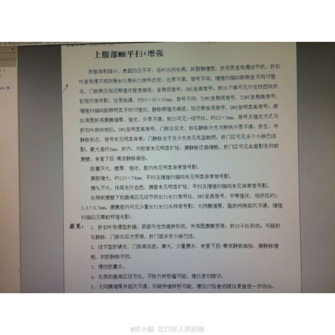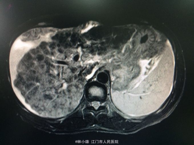 查体:神清,反应稍迟钝,计算力稍下降,皮肤巩膜轻度黄染,肝掌阳性,胸前毛细血管有扩张。腹膨隆,腹肌紧张,右上腹反跳痛。移动性浊音阳性。 辅查:如图。AFP6.12ng/ml,PT 20.5s PTA 46%。