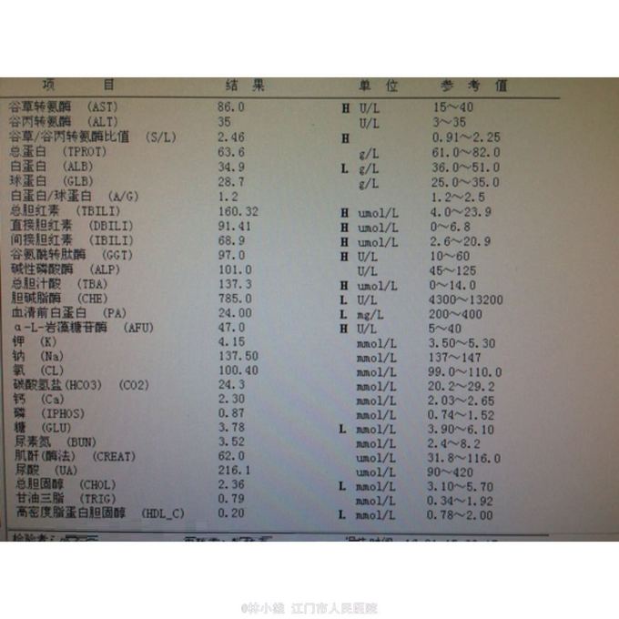 40岁男性,乙肝病史10余年,具体治疗不详,近2月不规律富有恩替卡韦。 腹胀腹痛1月余,身目黄染20天,伴乏力、纳差。 外院就诊查转氨酶、胆红素稍增高,治疗不详。后出现便秘,腹平片示不完全肠梗阻,CT示肝硬化、腹水,HBV DNA5次方。治疗后症状有好转,但仍身目黄染、腹痛,遂入院。