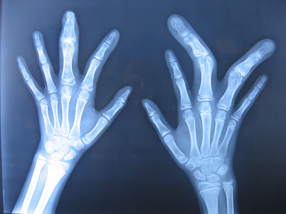辅查:双手部X光片示:右手中环指、左手中指骨质较其余手指骨质粗大、变长,指间关节关节间隙变窄,并出现侧弯畸形改变。