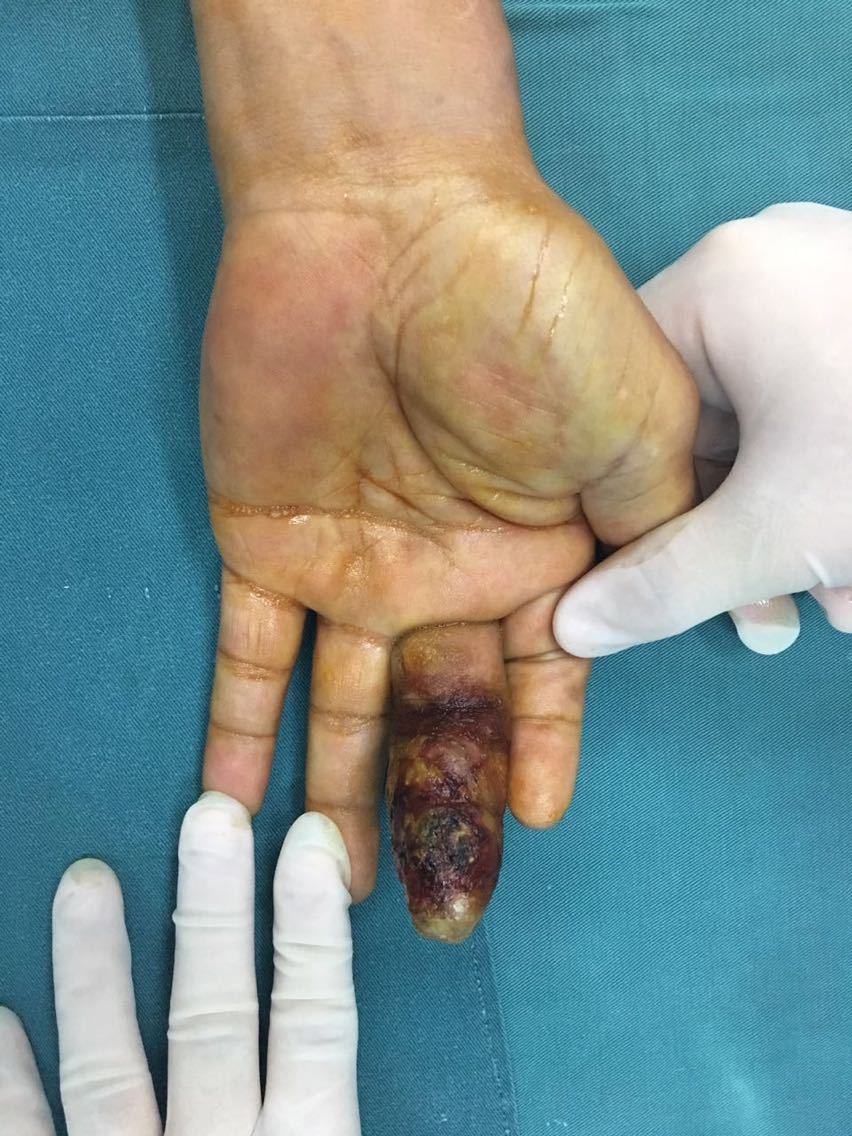 讨论:这类疾病其实并不少见,也并不复杂,处理的关键是早期及时有效的清创,很有可能不出现明显的不良影响。本例患者对于疾病没有给予足够的重视,导致组织大部分失活,即使保指成功,也可能丧失手指功能,很遗憾。