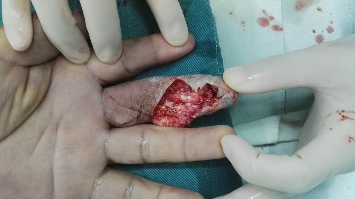 术中做左手中指掌侧连续“Z”字切口,深达屈肌腱腱膜层,可见皮下软组织已经腐败、失活,指掌侧血管、神经、屈肌腱均受累(动脉栓塞,神经、屈肌腱变性且连续性中断)。彻底切除失活组织,松开止血带,皮缘尚有血液渗出,考虑保指,遂行旷置处置,留待二期手术修复。