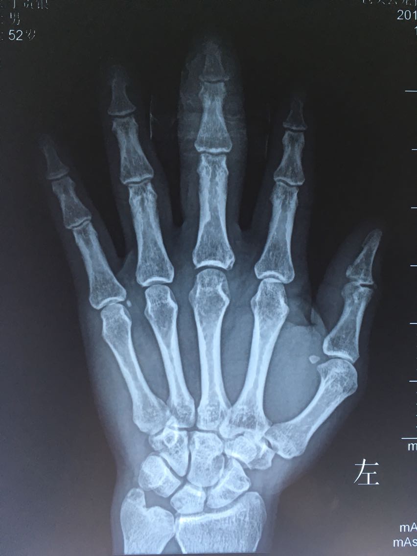 辅查:左手X光片可见骨质无明显异常,中指指体软组织影增粗,掌侧软组织影欠清晰。