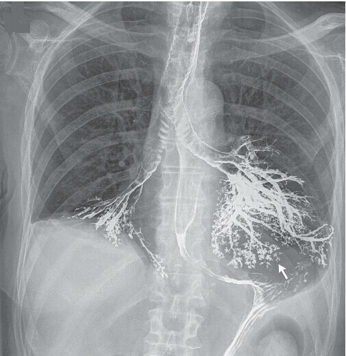 老年男性患者,因体重下降、吞咽困难就诊,并接受消化道钡造影检查,检查期间无呛咳等不适,检查结束后出行进行性恶化呼吸衰竭,进行气管插管后,入住 ICU进一步治疗,床旁胸部 X 线检查显示其左、右主支气管内均有钡剂存在,且基本显示出了支气管的轮廓,双肺下叶基底段支气管,左肺上、下叶的肺段支气管,均清晰显影;此外,钡剂也蔓延到了其较小的气道,并显示出树芽状(下图箭头处)的影像。支气管镜检证实患者的左、右肺下叶和舌叶均有钡剂存在,并吸出了大量钡剂。随即,患者出现休克,并出现心脏骤停,尽管经过了心肺复苏,液体复苏、应用正性肌力药和抗生素等紧急治疗,患者病情仍继续恶化;患者家属选择了保守的姑息治疗。患者于不久后去世。Mazen Albeldawi, M.D., and Rohit Makkar, M.D.N Engl J Med 2012; 366:1038;全文链接http://www.nejm.org/doi/full/10.1056/NEJMicm1108468。 消化道钡剂造影目前仍为临床常用检查方法,虽然钡剂误吸导致的呼吸衰竭并诱发死亡为罕见并发症,但不能忽视,需做好相关风险告知同时在出现对应情况时及时有效的处理