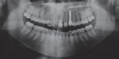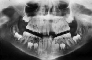 女,十岁,单侧唇腭裂致21牙、22、12牙畸形,且21牙、22牙间牙槽骨发育不全。经自体髂嵴骨移植后,拔除21牙、22牙行正畸治疗以将23牙移动至22牙位置。同时将正畸需拔除的下颌第一前磨牙移植到21牙的牙槽窝内。并在正畸治疗结束后树脂恢复21牙、22牙形态。患者18岁时拔除左上颌乳尖牙行种植义齿修复。