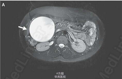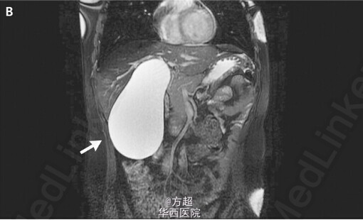 31岁青年女性,因间断发作右上腹疼痛就诊,自诉可于右侧腹部扪及缓慢长大包块;自诉无黄疸、发热、体重下降等情况,肝酶等实验室检查无异常,腹部超声未见异常,腹部MRI提示胆囊扩张17*8cm(如图A、B),但是并未发现胆管结石,胆管外源性受压以及胆管畸形;告知风险后予以腹腔镜下胆囊切除术,术中证实胆囊扩张积水,余无异常发现;术后患者症状逐步缓解。André Brito Queiroz, M.D., and Jocielle Santos de Miranda, M.D.N Engl J Med 2011; 364:e43;原文链接:http://www.nejm.org/doi/full/10.1056/NEJMicm1000943