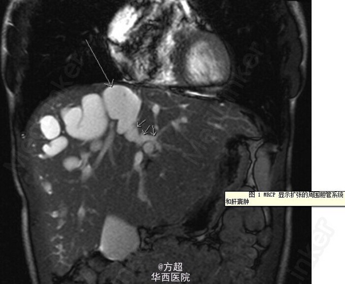 青年男性,因右上腹痛 4 周就诊,伴嗜睡、发热、盗汗、厌食及体重下降,既往有乳糜泻及肝囊肿病史,查体:T 38.2℃,肝脾巨大;血液化验结果提示胆红素 16umol/l、谷丙转氨酶 28IU/L、白蛋白 48g/L、国际标准化比率 1.05,均在正常范围,白细胞 14×109、C 反应蛋白 199mg/L、谷氨酰转肽酶 205 IU/L、碱性磷酸酶 274IU/L,较正常值升高;肝脏 B 超未见异常;进行了全面的败血症筛查之后,开始给予经验性应用广谱抗生素。全腹 CT 及 MRCP显示胆管系统明显的不规则的囊状扩张及巨脾,提示 Caroli 病合并门脉高压。经过抗感染治疗后症状好转离院。该病为常染色体阴性遗传,临床表现取决于发病年龄及是否存在肝脏、肾脏损害;易引起胆汁淤滞及胆管内结石等,该病引起终末期肝病及相关并发症的患者,可考虑施行肝移植。Cheung VTF, Joshi D, Amin Z, et al. Gut Published Online First;doi:10.1136/gutjnl-2014-306987