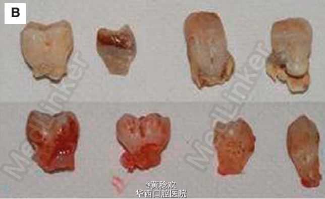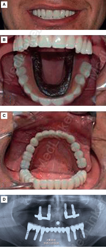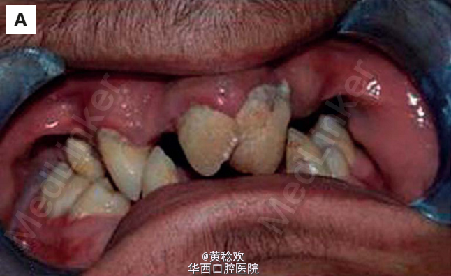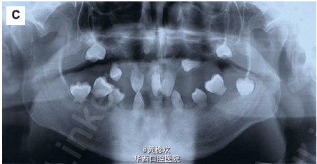 牙本质发育不良是一种罕见的常染色体显性遗传疾病(发病率1:100000),牙本质形成受阻,在临床上通常表现为临床牙冠正常,但通过放射检查可见牙根形态不良甚至没有牙根,无髓室腔,根周有无任何诱因的透射影。牙本质发育不良可分为I型和II型,前者更常见,表现为有乳牙和恒牙,牙冠正常,但牙根退化或无牙根,在牙釉质牙本质界可见一水平的放射投射影线,根尖周有透射影或囊肿。II型特点为牙根形态轮廓正常,部分牙髓闭塞,不定形的牙本质可形成髓石,长梗漏斗样牙髓室腔,线状根管,通常无根尖周透射影。因为牙齿缺乏正常牙根形态,很难通过临床上常规的操作将其移动排齐。 今日为大家分享一例因为牙本质发育不良I型的病人行全口种植修复的案例。