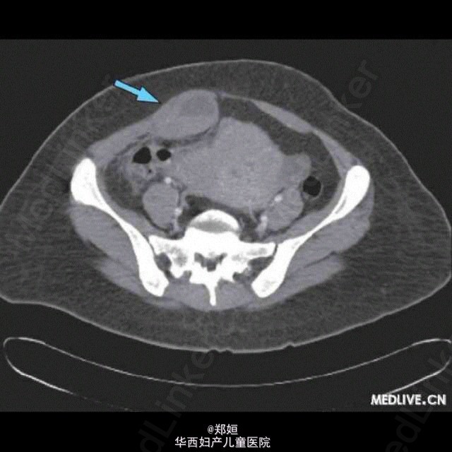 病历资料:女,37岁,右髂窝疼痛3天, 查体:右髂窝部压痛,在骨盆和下腹部可触及一直径为16 cm的肿块。患者无宫颈刺激, 孕检结果为阴性。入院时,血红蛋白105 g/L,白细 胞计数4.93×109/L。有血小板减少症(108×109/L),但在13 d前患者血小板计数还在正常范围内,凝血酶原时间延长至15.1 s。 腹部超声和CT均显示一个巨大球状子宫,子宫壁肌层回声粗糙,提示为子宫内膜异位症。但骨盆-腹部的肿块可能主要是由腹直肌鞘内的机化 血肿引起的。 血清学检测表明患者近期有登革热病毒的感染,患者IgM抗体阳性,IgG抗体阴性。 CT还偶然发现了一个位于左侧股静脉的血栓,多普勒超声显示左侧腿部的广泛性深静脉血栓。血栓形成倾向筛查试验显示蛋白S、蛋白C及抗 凝血酶Ⅲ浓度正常。 诊断:登革热病毒感染后导致的出血 治疗:停用口服避孕药、安置下腔静脉滤过器,推迟5 d进行抗凝治疗以稳定血肿。患者血小板计数恢复正常后,开始终身服用华法林预防性 治疗。采用保守方法治疗血肿,未行引流。 结局:6个月后,患者腹直肌鞘内血肿完全消失。 http://case.medlive.cn/obgyn/case-article/show-40304_207.html