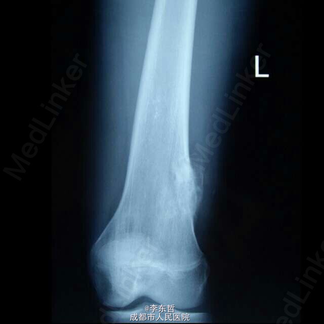 患者男性,既往无异常,自诉左股骨远端处偶然触及无痛性肿块,当时未引起重视,一个月后来医院检查发现骨软骨瘤,遂行手术切除。