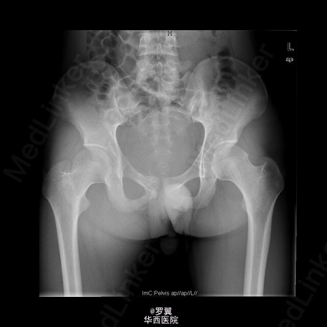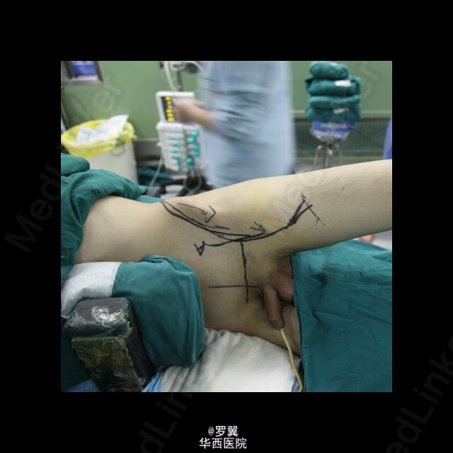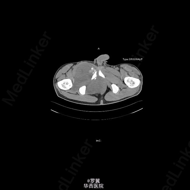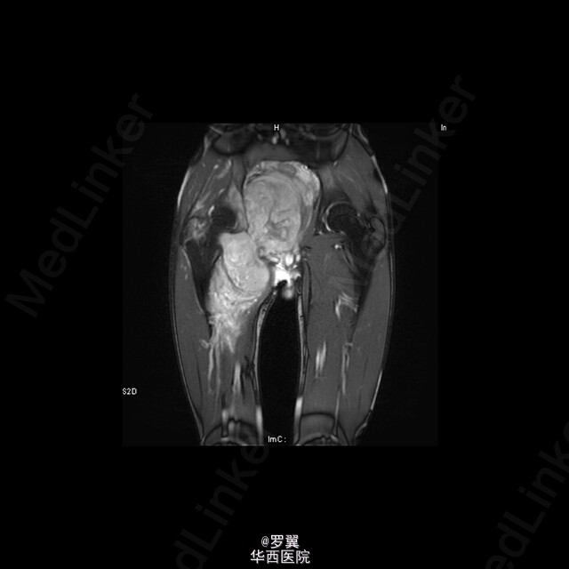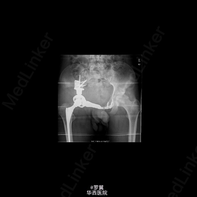 患者男,21岁,因“ 右髋疼痛7月伴右腹股沟包块2月”入院。查体:视:右腹股沟区可见一大小约15cmx10cm包块,未见浅表静脉怒张,无红肿及渗出,皮肤无破溃。触:质硬,边界不清,皮温稍高,局部深压痛。在右大腿根部前正中可扪及股动脉搏动。右侧鞍区感觉明显减退,右大腿上段内侧浅感觉减退。.肛门括约肌肌力Ⅲ级。动量:右髋伸90°,伸-10°。做伸直动作时患者包块区域疼痛加重。复查ct:盆腔巨大肿瘤,骨质破坏,考虑恶性肿瘤可能性大,核磁共振:考虑盆腔恶性肿瘤。入院后,完善相关辅助检查及术前准备,并采用阿霉素化疗方案化疗后,后在全麻下行腹主动脉球囊阻断下右侧骨盆肿瘤切除、腹股沟淋巴结清扫、人工组配式半骨盆置换术。术后1周即能拄拐下地,右髋能屈曲50°,右膝能屈曲65°。现出院。
