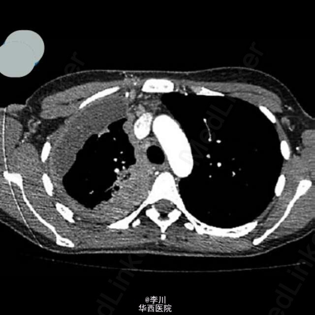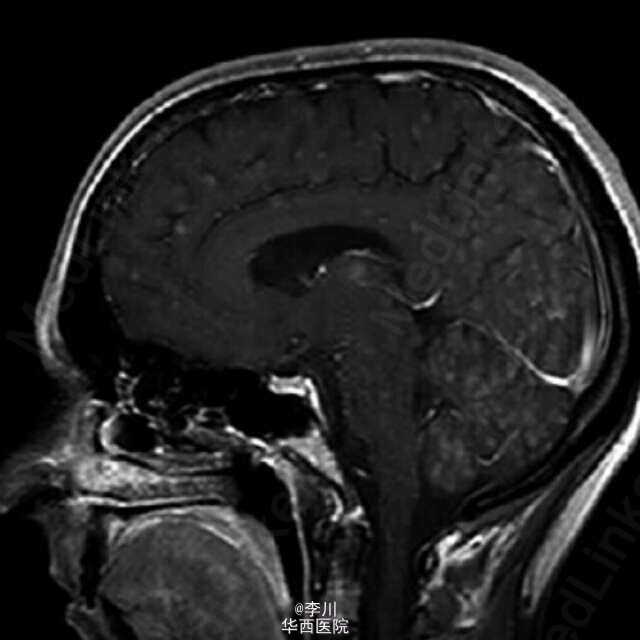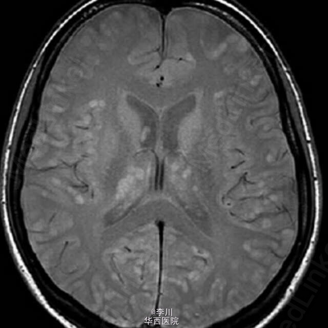 患者女性,38 岁,肺腺癌,年吸烟量 15 包。胸部 CT 表现右上肺脊柱旁肿物。胸膜活检病理证实为乳头状肺腺癌。头颅磁共振显示除灰质外,大脑皮质,基地核和丘脑 粟粒状结节。可以媲美粟粒性肺结核Dziadziuszko K, Szurowska E, Pienkowska J, et al. Miliary Brain Metastases in a Patient with ROS1-Rearranged Lung Adenocarcinoma: A Case Report[J]. Journal of Thoracic Oncology, 2014, 9(5): e34-e36.