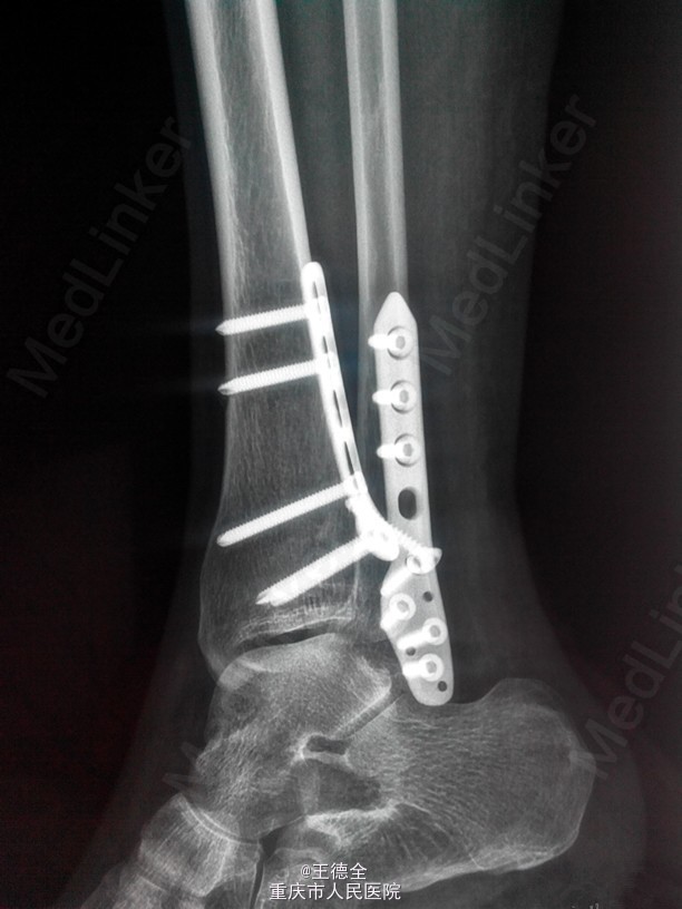 患者女,44岁,车祸致右踝关节疼痛,肿胀,活动受限入院。肿胀消退后于手术治疗,选择后外侧入路做一个切口,克氏针临时固定,最终钢板固定。
