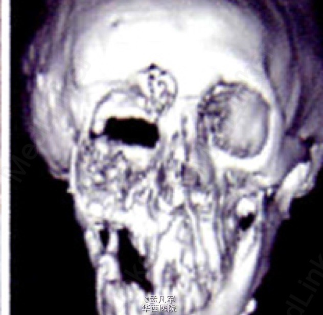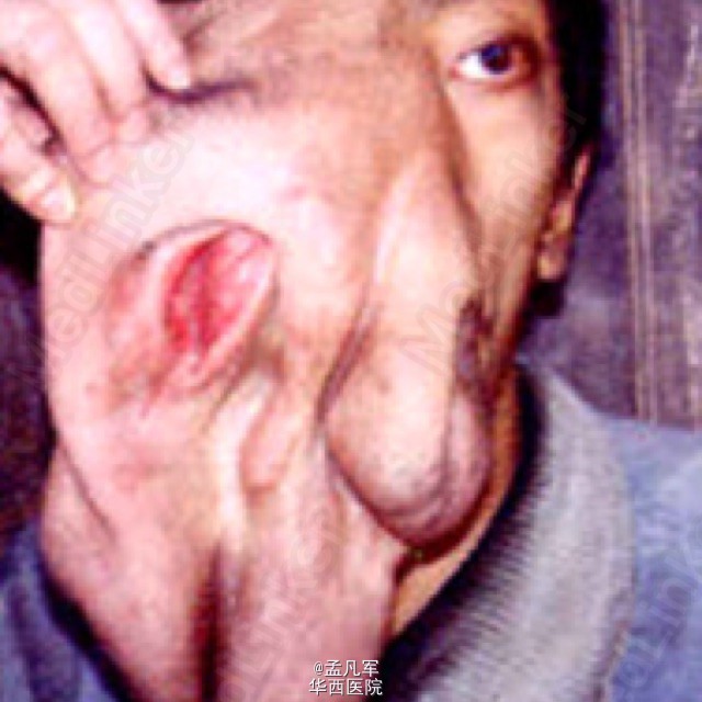 患者,男,22岁。神经纤维瘤病呈“象面”严重畸形。患者右颜面巨大囊袋样包块29 cm×17 cm,侵及额顶、颞部及鼻口部,右眼球脱出,右睑裂8 cm,右鼻孔8.5 cm,大口畸形。CT及MRj检查:右枕骨缺损,右侧眼眶内下壁骨质变形缺损下移,额颞脑组织通过缺损疝出,右上、下颌骨变薄变形。一期手术面部肿瘤主体切除,将脱出变性眼球及变性腮腺摘除,行眼眶底钛网重建,组合皮瓣成型术,切除摘出物重4 kg。二期手术时于4个月后行残余肿瘤继续切除,阔筋膜悬吊,组合瓣鼻唇整形术。三期手术于二期术后4个月进行,再次切取阔筋膜悬吊,面部精细整形术。结果8个月后手术完成,术后随访4个月,面部整形效果满意。患者生活自如,步态平稳,能平卧。中国修复重建外科杂志2008年1月第22卷第1期,作者吴军等,万方全文搜索