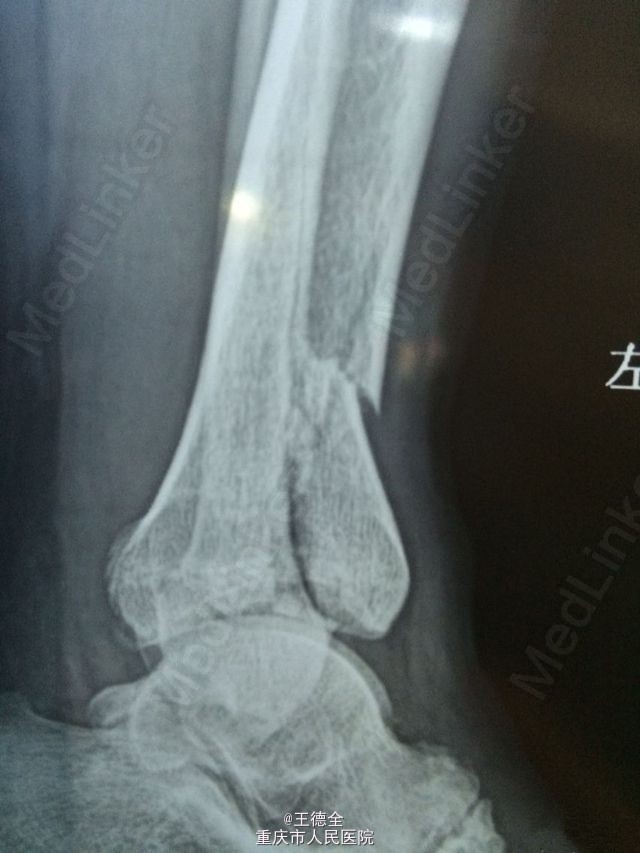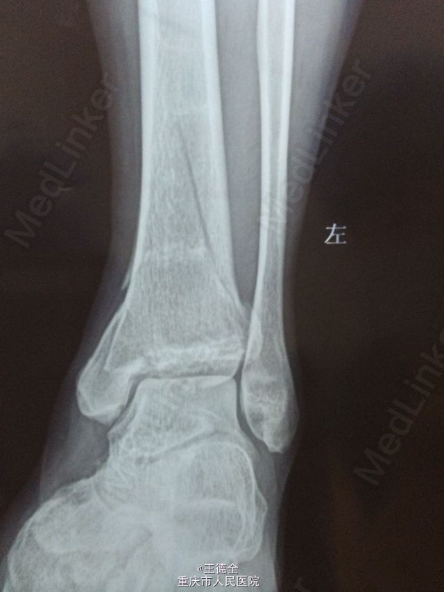 患者老年男性,高出摔落伤,查体:左踝部中度肿胀,畸形,压痛,活动受限,足背动脉波动好,足趾运动及末梢血运、感觉正常。