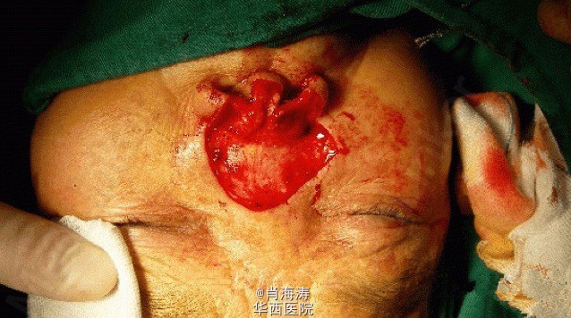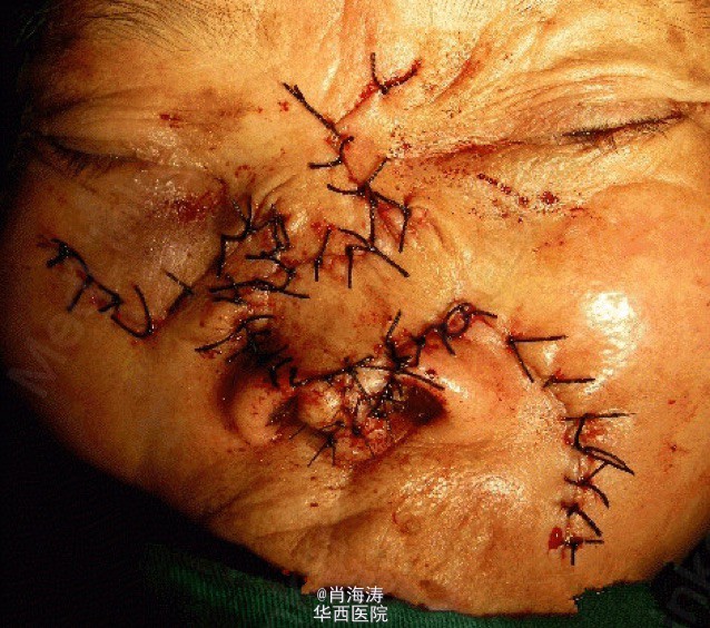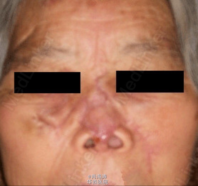 患者为73岁女性。2012年患者因鼻部有花生米大小的皮损,经病检确诊为皮肤癌,遂接受两次放疗,治疗后皮损部位好转,7月前皮损再次复发并发展迅速。查体:鼻部可见约3cm×3cm不规则类圆形肿块,稍突出皮肤表面,中央凹陷,呈菜花样,表面溃破,有干痂形成;有淡黄色渗出液,肿块无压痛、无活动度,与周围组织分界不清;鼻尖部消失,呈畸形;双侧鼻孔不对称,右侧鼻腔前庭粘膜破溃,已结干痂,左侧鼻腔前庭粘膜完整,双侧鼻腔通气良好。系鼻部皮肤癌致鼻尖部缺损、鼻部畸形。采取耳甲及耳轮软骨复合瓣做支架重建鼻小柱及鼻翼软骨,运用面部3个皮瓣覆盖鼻部皮肤缺损,利用耳甲及耳轮软骨复合瓣的耳部皮肤做鼻粘膜衬里的手术方案。