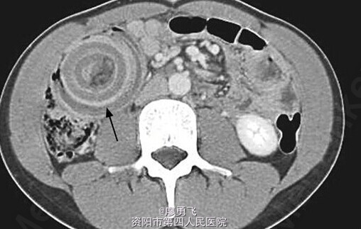 中年男性,突发腹痛6+小时入院,否认既往史,查体全服压痛,右下腹明显反跳痛;辅助检查:全腹部CT可见右下腹同心圆征象,提示肠套叠(忘了采图,附图为之前收集的,不过该病例同样典型),肾周、盆腔大量腹腔积液,不排除肠坏死可能,急诊剖腹探查,腹腔大量淡血性液体,末段回肠套入盲肠,末段回肠、回盲部、升结肠肠管呈紫红色,行右半结肠切除术,术后剖视肠管发现回盲部溃疡型新生物,术后病理提示低分化腺癌。术后病人恢复可,目前已于肿瘤科开始后续治疗。