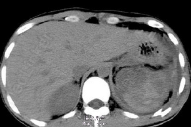 中年男患,于2+天前从高处坠下,全身多处受伤,曾于创伤抢救室就诊,行ct检查提示:颅内出血,肋骨骨折,肺挫伤等,转入某医院治疗,诊断“ 高坠伤,多发伤,颅内出血,肋骨骨折,肺挫伤,鼻骨骨折,上颌骨,右侧眼眶外侧骨折“。半天前出现腹痛,予以腹腔穿刺抽出不凝血,转入我科。下病危,血常规,全腹部ct。 查体:患者神志清醒,头面部肿胀,双眼睑淤紫,瞳孔等大等圆,左瞳直径3MM,右瞳直径3MM,双瞳对光反射灵敏,呼吸道通畅,胸廓正常,胸廓挤压征(+),呼吸正常,已安置闭式引流,双侧肺呼吸音对称,双肺未闻及干湿音,腹部无开放性创伤,全腹无压痛,无反跳痛,四肢无开放性创伤。骨盆无开放性创伤,骨盆挤压征(-),脊柱无叩压痛,耳鼻喉正常,颈部正常,背部无开放性创伤,无其它特殊情况。
