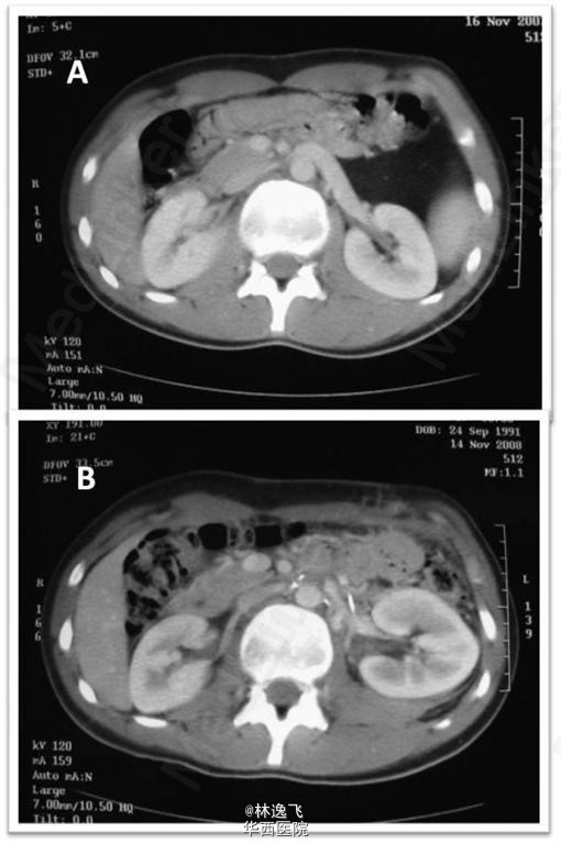 患者是17岁的男性青年患者,主诉左腰部钝痛数月,偶放射至左腹。无异常病史,麻醉可缓解疼痛。后疼痛频繁和加重,伴有肉眼血尿。不伴发热,且血流动力学稳定。仅有一次,由于诊断贫血,给与输注2U红悬。 辅助检查,患者有轻微的左侧精索静脉曲张。查血示低血红蛋白,尿常规示:蛋白尿。超声和尿路造影无特殊。腹部和骨盆的CT示,左肾静脉扩张。左肾可见一巨大脂肪瘤,加大的肾静脉的角度,使其穿过肠系膜上动脉的后面。(图1) 确诊后,手术切除脂肪瘤,缓解肠系膜上动脉对左肾静脉的压迫,将左肾静脉转位直接进入下腔静脉。 转自BJUI