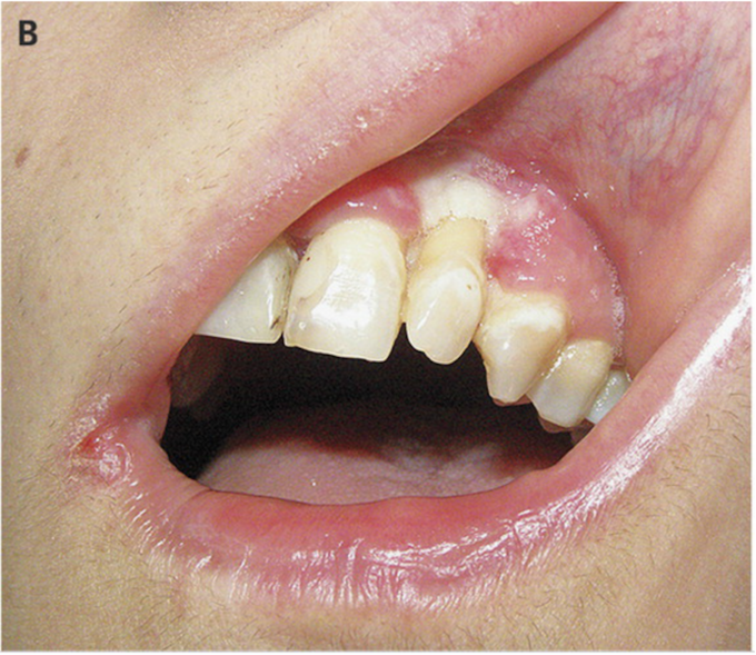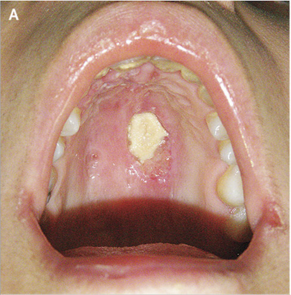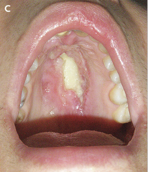 女性,34 岁,有上腭部和牙龈溃疡病史 3 月。鼻内窥镜检查正常,鄂活检标本细菌培养提示金黄色葡糖球菌阳性,组织病理学检查未发现肿瘤。主管医生按炎症处理,予抗感染治疗,第 10 天患者出现发热和左侧脸部间歇性肿胀。两个星期后,患者出现上颚部病灶范围扩大(图 C),进行第二次活检,组织病理学活检提示为结外 NK/T 细胞淋巴瘤(鼻型)。该名患者接受放疗和改良的 SMILE 方案(DEX+MTX+IFO+L-ASP+VP16)化疗,随后进行自体造血干细胞移植。治疗后 8 个月复查仍然缓解,无证据显示淋巴瘤复发。来源:丁香园