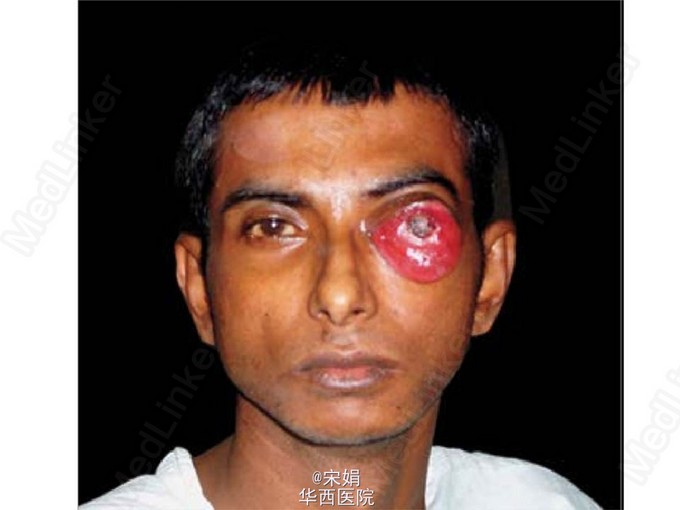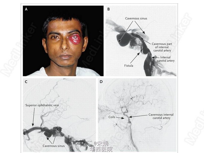 26岁男性,2月前头部钝器伤,左眼急进性疼痛、肿胀、视力下降。左眼查见结膜水肿,突出部分有搏动感,角膜溃疡。听诊左侧太阳穴闻及血管杂音。
