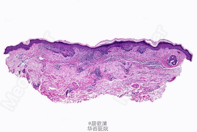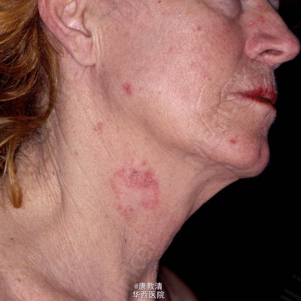 患者女,表现为颈部红斑,病理证实浅表性基底细胞癌 本以为是普通的良性、炎症性皮肤病,比如湿疹、神经性皮炎、接触性皮炎之类的… 此病例提示:1.人的经验有限,一定得多多思考、多多积累;2.临床诊断困难时,一定要做病理,辅助诊断。