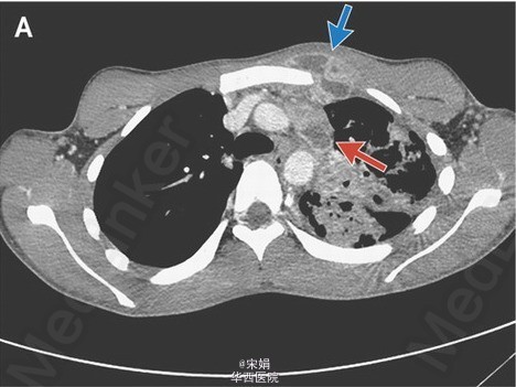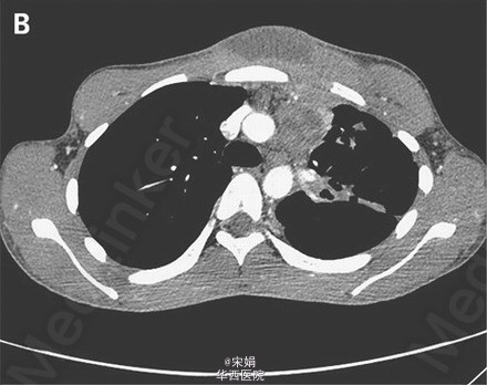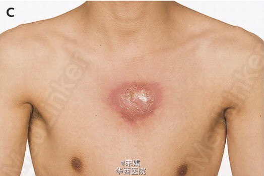 18岁男性,咳嗽3+月,伴淡红色痰、体重下降、发热。一周内前胸壁出现一局限性红肿。胸部CT示哑铃型脓肿(皮下脓肿通过窦道与深部脓肿相通:前胸壁皮下脓肿→左侧纵膈淋巴结内脓肿)、左肺上叶广泛肺实质异常。痰涂片、痰培养提示为结核分枝杆菌,HIV(-)。接受标准抗结核治疗8周,感染情况进展,皮下脓肿增大、出现红斑、有波动性。立即给予脓肿切开引流术。术后未再出现恶化征象,但脓肿引流完全后仍需行整形手术达到美观效果。