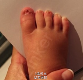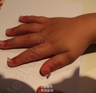患儿为 2 岁男孩,因手指甲和脚趾甲全部脱落就诊。患儿在 2 个月前有一次大面积皮疹和发热病史,当时其 32 岁的伯母在照料他以后也出现了皮疹。 这是由柯萨奇病毒 A6(CA6)感染导致的手足口病(HFM)引发的脱甲症(onychomadesis)。脱甲症患儿无明显疼痛,这是其非特异性表现(在指甲基质的指甲生长突然停止所致)。脱甲症可伴随外伤、感染、全身性疾病及药物反应同时发生,这些决定了脱甲后几个月里指甲再生长的早晚。 手足口病通常由柯萨奇病毒 A16 和肠病毒引起,可导致轻度发热和口腔黏膜、舌头、脚底、手掌等部位出现疼痛性水泡。因有很多表现相似且手足口病例有大量非典型特点,通过临床分离病原体测序可确定为柯萨奇病毒 A6。观察到的非典型特征包括接触过感染儿童的成人发病、范围更广的皮疹及皮肤病变以及在手足口病痊愈数周后指甲脱落等。
