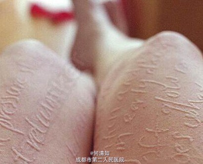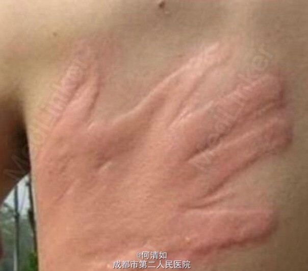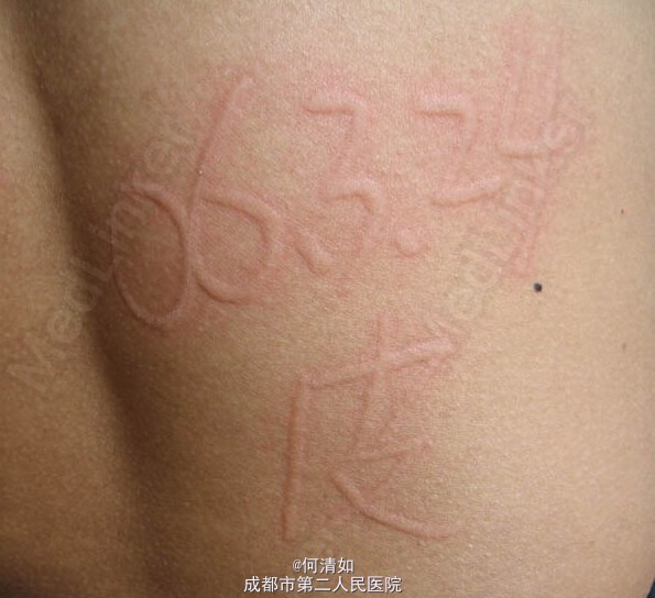 皮肤划痕症也称人工性荨麻疹,是皮肤血管的过敏反应。 用指甲或其他钝性物体轻划皮肤后,即可出现一条条红色且略高于皮肤的痕迹,可自然消退。 皮疹随划动方向出现,形态各异,所以显得“好玩儿”。