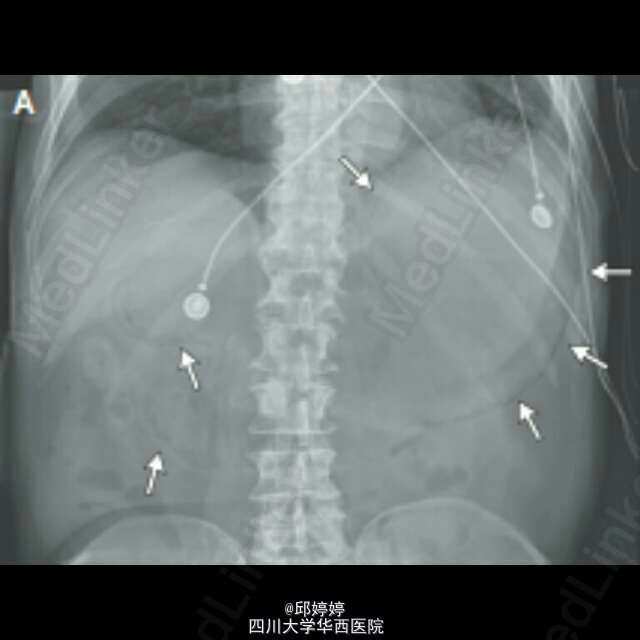 患者,老年男性,胰腺癌晚期,腹痛,呕吐12h,触诊腹部压痛,板状腹。平片(图1)示腹腔严重积气,CT(图2-3)示胃肠周围,门静脉积气。患者拒绝治疗,48h后死亡。