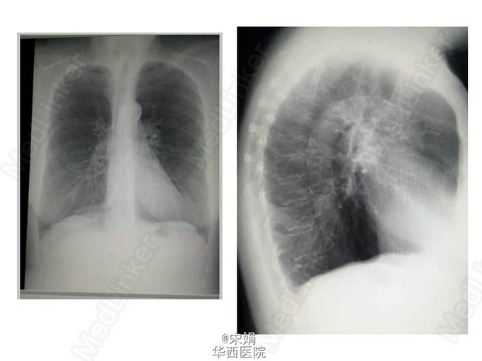 COPD病人 X线典型表现是肺过度充气,可见肺容积增加,肋骨走向变平,肺野透亮度增高。横隔位置低平,心脏悬垂狭长。这个病人的侧位胸片竟然可以清晰的看到主动脉和主动脉弓!