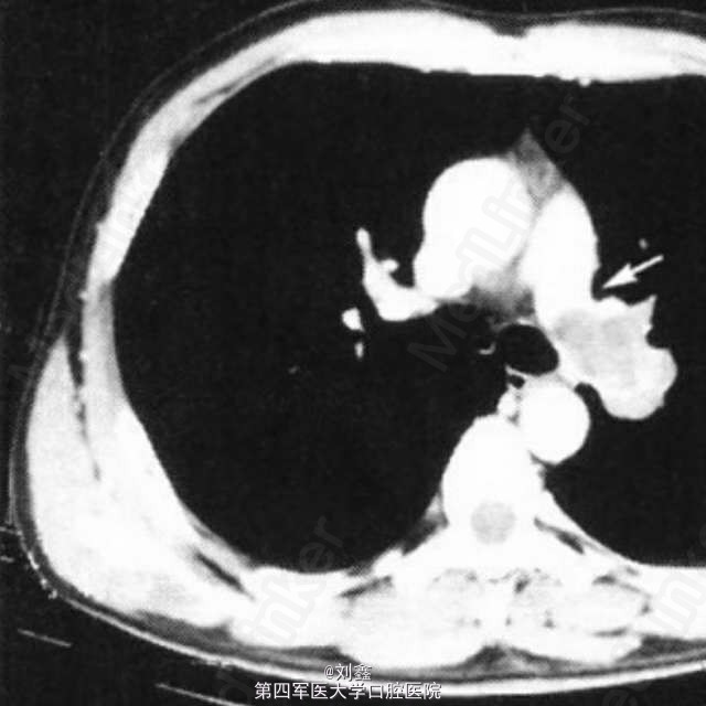 患者男,38 岁。因刺激性咳嗽 2 月余入院。既往体健,无手术史,吸烟史 20 年,15 支/d。CT 检查示,左肺根部肿物,包绕左肺动脉干,并突入左肺动脉干内,考虑左肺中央型肺癌 (图 1)。入院后检查未见远处转移,行左侧开胸探查。 术中发现左肺门左肺动脉干处大块肿物,大小约为 4.2 cm×3.8 cm,包绕左肺动脉干。游离左肺动脉干,可触及左肺动脉干内肿块,质地较硬,仍考虑中央型肺癌侵及肺动脉。术中决定行左全肺切除,依次切断左肺上下静脉及左主支气管,以血管闭合器闭合左肺动脉干,切除左全肺,清扫淋巴结。术后大体标本示,肺动脉干内球形肿物,表面光滑。病理检查示,左肺动脉干平滑肌肉瘤。免疫组化结果示,肿瘤起源于肺动脉平滑肌细胞。术后患者恢复良好,但拒绝行放化疗及其他治疗,于术后 9 个月死于远处转移。