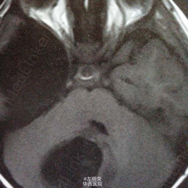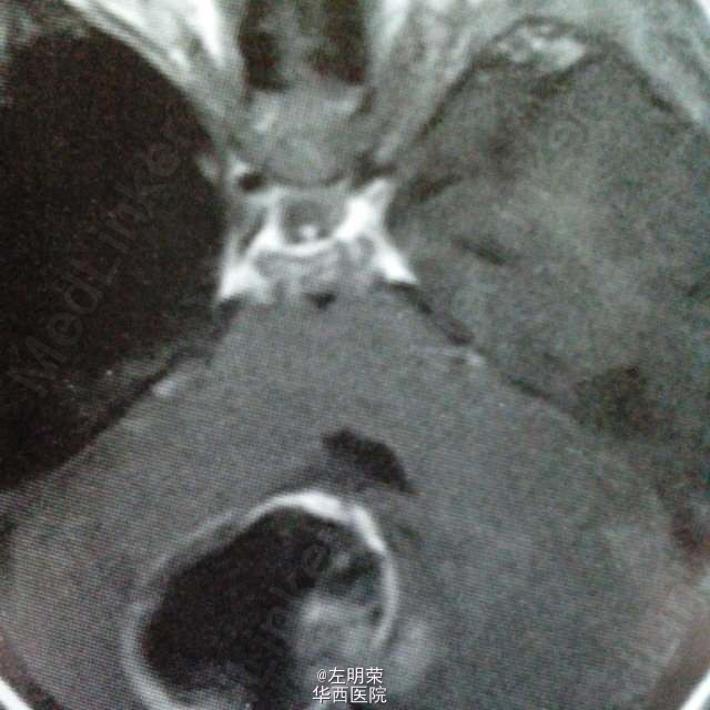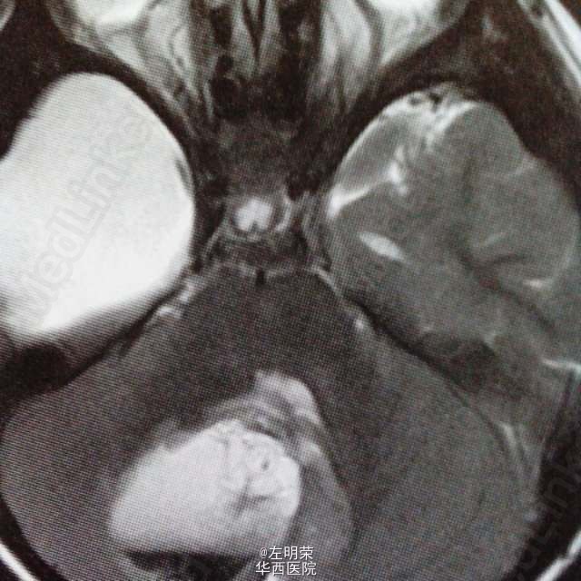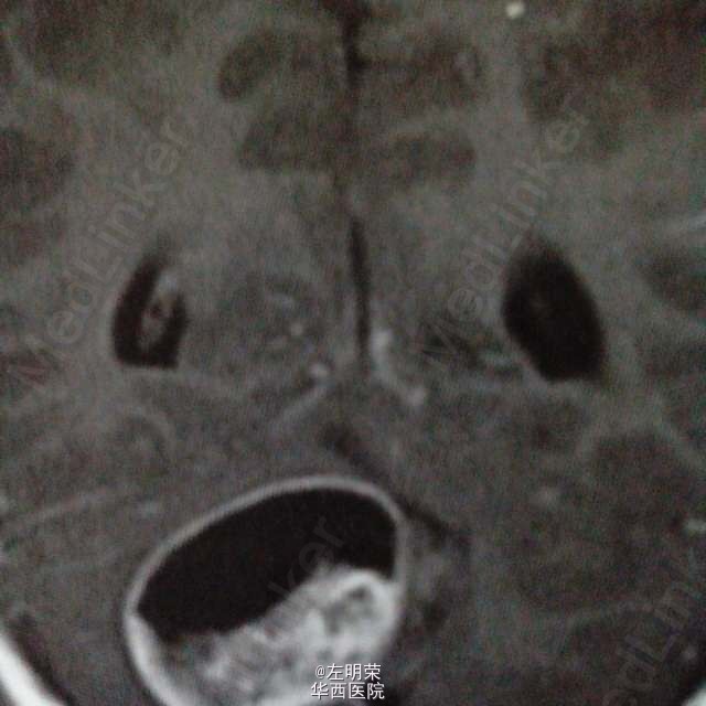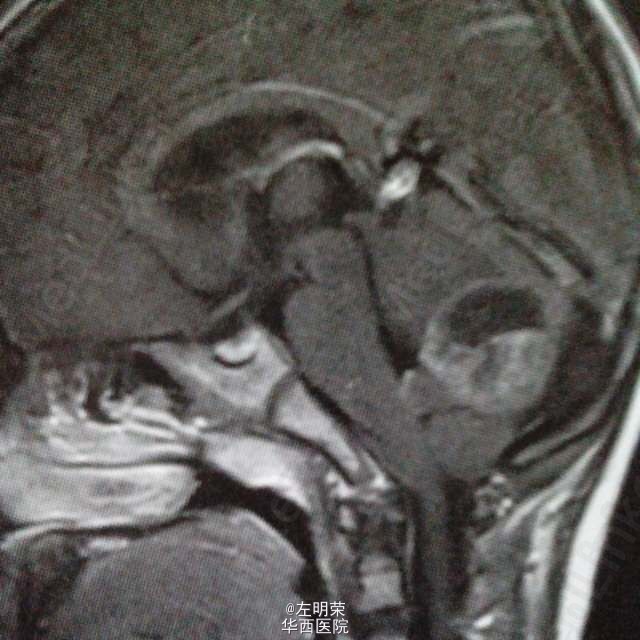 6岁小儿,主诉间断性头痛伴恶心,呕吐6天。影像特点:右侧小脑半球可见明显强化的囊实性占位,囊内可见出血后形成的液平,瘤旁轻微水肿。考虑星形细胞瘤,髓母细胞瘤,室管膜瘤可能。行手术切除治疗,见囊实性肿块,囊内坏死出血,肿瘤血供丰富,边界不清,近全切。病理结果:髓母细胞瘤