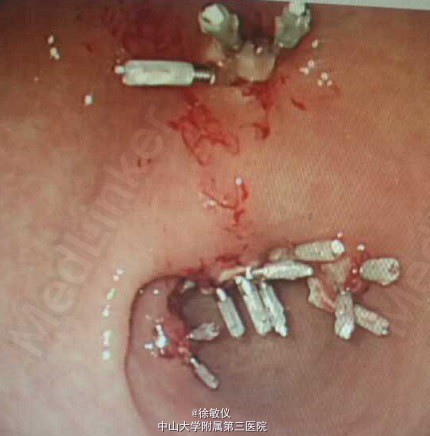中年男性,内镜下发现胃窦部有五个大息肉,予行金属夹结扎后圈套电凝治疗。