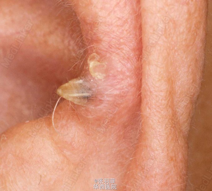 日光性角化病是日光相关的角化异常,主要发生于暴光部位,皮损为褐色角化性斑片,表面覆以不易剥离的黑褐色鳞屑。一般认为是癌前病变,有恶化鳞癌的可能。 而皮角是一种形态学诊断,也被认为是癌前病变,多发生在某些皮肤病如脂溢性角化病、日光性角化病的基础上,由于病损处角质物异常增多而形成突起状角化性皮损,形似动物的角。