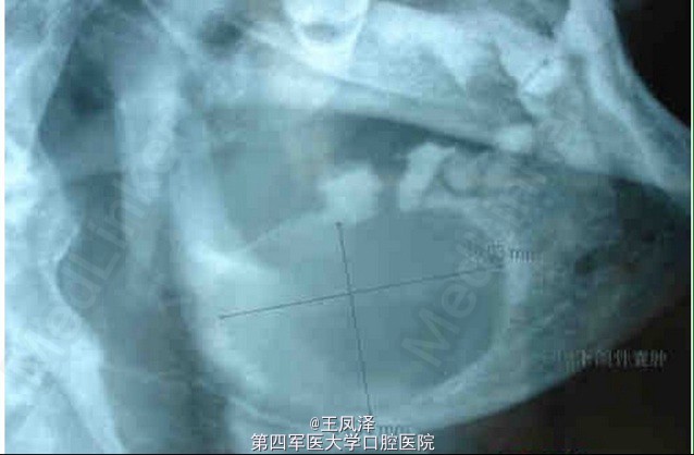 颌骨囊肿指颌骨内出现一含有液体的囊性肿物,逐步增大,颌骨膨胀破坏,据发病原因分为牙源性和非牙源性,牙源性者即囊肿由成牙组织或牙演变而来,非牙源性囊肿则有胚胎发育过程中残留于颌骨内的上皮发展而来,如面裂囊肿,亦可为损伤所致的血外渗性囊肿以及动脉瘤样骨囊肿。