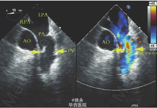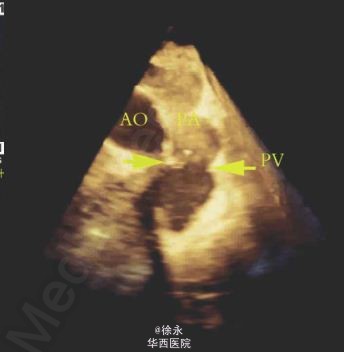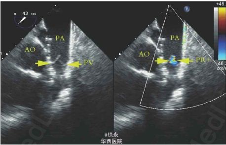 患者,女性,39 岁,25 年前因“法洛四联症”行外科治疗,近月出现活动后胸闷、心慌。超声心动图示外科术后补片下缘室水平残余分流,肺动脉瓣返流(重度)。住院期间先后行室缺残余漏封堵术+经皮导管肺动脉瓣置入术。
