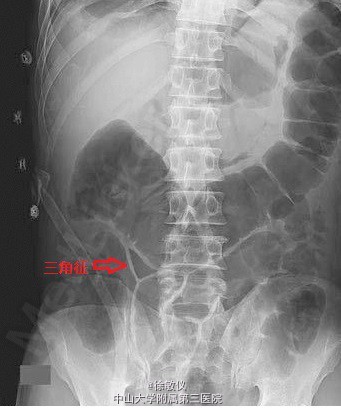 56岁男性,因腹泻及上腹钝痛3天就诊。体检发现腹部弥漫性压痛及反跳痛,肠鸣音消失。腹平片显示三个相邻肠袢形成一个小的含气区域,符合腹腔内游离气体的表现(三角征)。术中发现胃溃疡穿孔且合并两个腹腔脓肿。