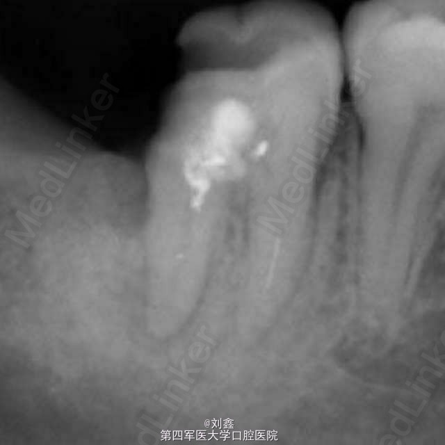 患者女,29,右下后牙3年前于外院行治疗,冲填物脱落来我科。牙片示近中根有断针,遂行再治疗。