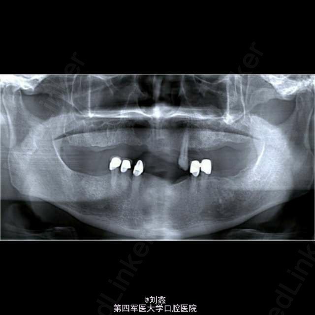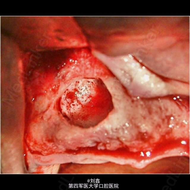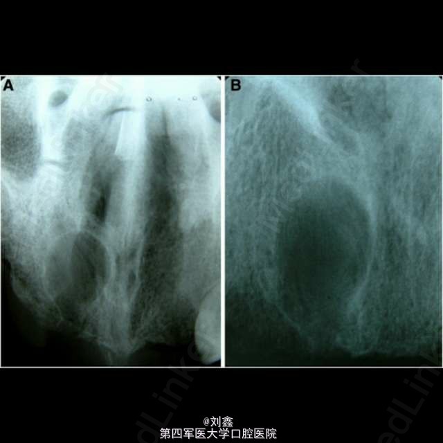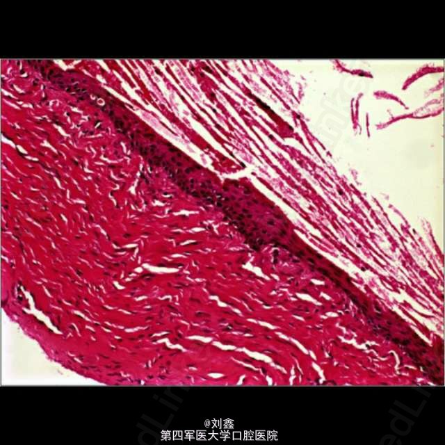 患者男, 59 岁,因曲面断层片显示上颌前部见一单房透亮影像来诊,行囊肿切除活检术,病理结果显示为表皮样囊肿。 表皮样囊肿是一种可发生在全身任何部位的良性软组织瘤样病变,男性多见,青春期前出现需考虑 Gardner 综合征。病变多局限、单个。主要病因为局部毛囊炎症,以及上皮愈合过程中毛囊漏斗部的增生及创伤性的上皮植入。影像学见单房透射影还需结合病史、检查等鉴别诊断根侧牙周囊肿、角化囊肿、球上颌囊肿、创伤性骨囊肿、成釉细胞瘤等。组织学鉴别应排除皮炎囊肿,皮样囊肿中可见皮肤附件如毛囊、皮脂腺、汗腺等。普遍认为病因包括先天性及创伤性,但有证据显示深入到颅骨等硬组织引起囊性扩张的病变多由于创伤性植入。表皮样囊肿预后良好,治疗可行保守的手术切除。