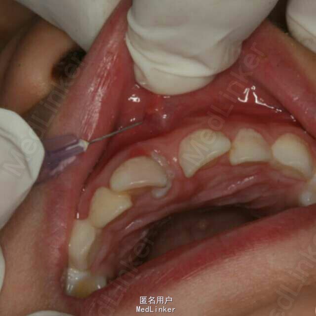 患者、王xx、4岁、男孩。主诉:上前牙松动,要求治疗。现病史:一个月前、患儿不慎碰墙,导致上前牙受伤,当时未做任何处理,最近两天,患儿感觉上前牙松动,轻微疼痛,遂来我院儿牙科就诊。专科检查:右上乳Ⅰ松动一度。右上乳Ⅰ近中侧有一畸形牙尖。x线根尖片:右上乳Ⅰ根尖1/3折断,其近中有一多生牙,该多生牙压迫右上乳Ⅰ近中根面吸收。同时发现左上乳Ⅰ也有一颗多生牙。诊断:(1)右上乳Ⅰ根折。(2)多生牙。处理:1)建议拔除右上乳Ⅰ和其下方多生牙,待患儿到能配合的年纪再拔除左侧乳Ⅰ下方的多生牙。2)同时拔除右上乳Ⅰ和两枚多生牙。给患儿目前讲明两种方案的利弊,患者选择第二套方案。 术前建议患儿母亲做全麻拔除。患者母亲不同意全麻,害怕对孩子大脑有影响。局麻可能因患儿配合欠佳,导致手术终止。患者同意可能出现的意外导致手术终止。签手术知情同意书。
