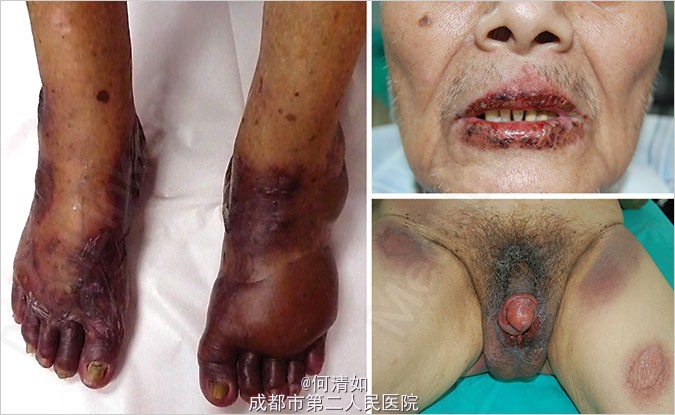86岁男性,因疼痛性泛发大疱就诊。 患者因轻微背痛口服25mg双氯芬酸,8小时后逐渐出现四肢瘙痒、烧灼感,并起疱。 4月前因注射双氯芬酸出现过类似情况。