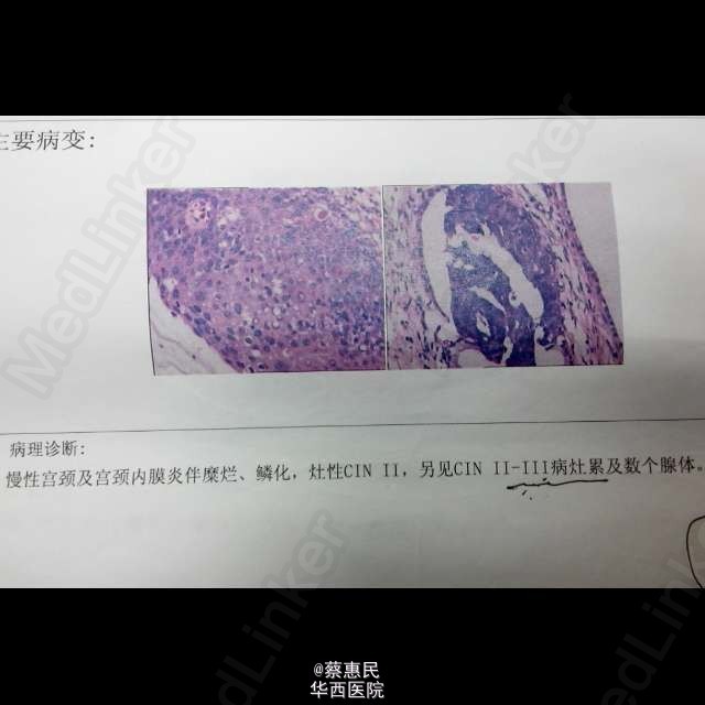 宫颈上皮内瘤变(CIN1)属于组织学的低级别(轻的)宫颈癌前病变,50%可以自然恢复正常,另50%则会进展成高级别的(重的)宫颈癌前病变。此中年女性行阴道镜检查如图。 阴道镜拟诊:异常转化区 CIN I。脱落细胞结果: 送宫颈脱落细胞查见低度鳞状上皮内病变细胞LSIL。 治疗方案:和患者讨论后采用了锥切手术,切除癌前病变。