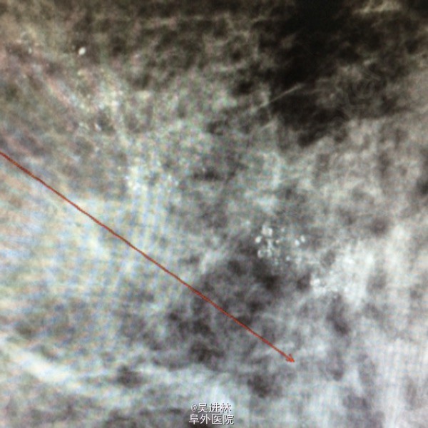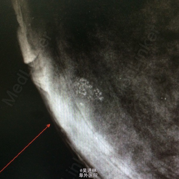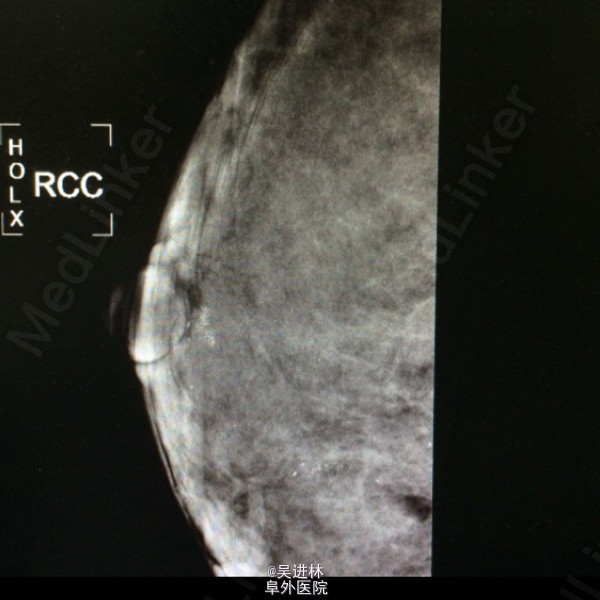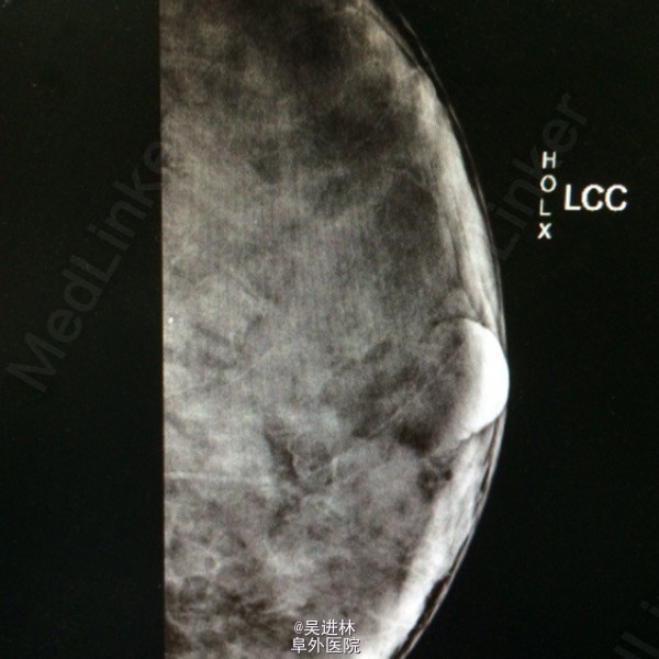 今天本来打算继续腹膜后脂肪肉瘤,但是悲闻姚贝娜因癌去世,遂借以下病例来谈谈乳腺癌钙化特点:患者中年女性,慢性起病,双侧乳房肿物4年余,以“双侧乳腺癌可疑”收入院。一般女性绝经候乳腺腺体开始萎缩,而此人腺体高度发达,脂肪组织几乎不可见,也是令人称奇(见钼靶)。查体双乳均可触及肿块,质硬,境界清,无压痛,表面欠光滑。腋下淋巴结未触及。钼靶显示双侧均可见簇状钙化。术前几乎被当作双侧乳腺癌来教学查房了一番,术后病理提示乳腺腺病。